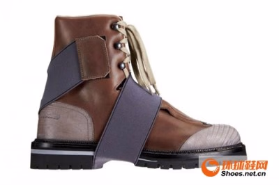 Tall Hiking Boot重点在于选用了坚固耐用的皮革打造,皮革补强的鞋头更充满质感。鞋帮处的钩型鞋带扣的细节无不体现了怀旧风格。而鞋款本身最显着的特点在于鞋面与后跟处的双重弹力皮筋的设计,很好的具有固定作用,当然其装饰性与设计感也是一眼便知,足以激发时尚人士的兴趣。