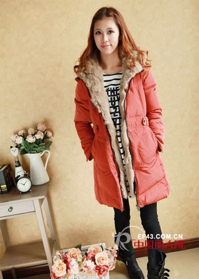 腰部有修身设计,超显瘦裁剪,上身完全没有羽绒服的臃肿,整个帽子和前襟都是兔毛镶嵌的,毛茸茸的超温暖啊,修身裁剪带来无敌显瘦效果。