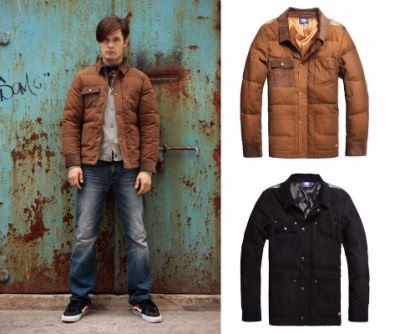 男式充棉夹克分海军蓝与黑色两款,羊毛质地使其保暖性能更佳,美式海军款型设计散发男性荷尔蒙,帅气出位。搭配牛仔裤和皮鞋彰显冒险精神,工装裤与板鞋的组合也是不错的选择。