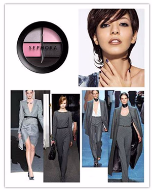 持续大热的烟熏妆搭配中性灰的西装,帅气十足又不乏女人的媚态。烟熏妆容的打造选用大地深色系眼影,可试试丝芙兰全新推出的四色眼影眼线粉组合,色彩饱和度和持久度十分显著,平滑均匀的覆盖力,让你演绎出明亮跃动的魅人双眸;而中性西装可根据自己的喜好来选择。