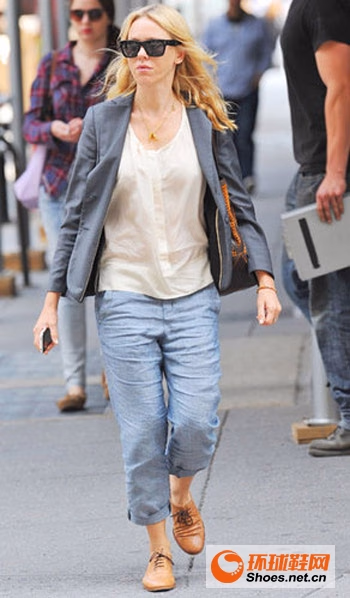 内奥米·沃兹的这身复古装带给你清新自然的同时,又彰显了她对服装的独特品味。灰色的休闲西服内搭剪裁独特的深领打底衫,下身配质感柔软的翻边9分牛仔裤,总会给人带来特别舒适的感觉。