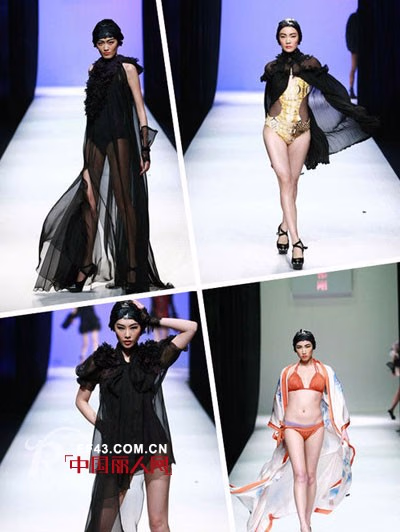 祁刚“悦龙”时装秀中,除了对龙的华服的无限想象力之外,还玩起了度假泳装搭配小礼服这样的性感创意,而透视长裙及妖娆男装,以及蕾丝,玫红,桃花的大量应用,更是强调了祁刚设计中独有的华丽与时尚感。