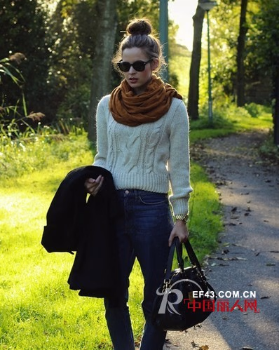 复古风的短款毛衣做内搭,缠绕的长围巾外搭黑色大衣,是本季很IN又容易学习的大牌风混搭法。搭配九分牛仔裤,帅气十足。天凉的时候配上外套,就可以轻松穿出潮范来。