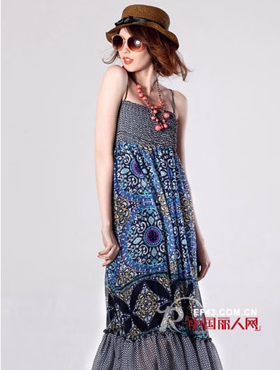 满夏日气息的波西米亚风长裙,精致的民族风印花,细腻的褶皱,带点小性感的吊带设计,甜美诱人,搭配厚底凉鞋、绚丽的彩色项链以及个性的编织帽,就可以将甜美 + 性感 + 个性的完美女孩演绎得美轮美奂。
