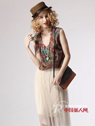 清凉的印花雪纺背心,绝对是今夏的大热单品,搭配米色纱裙,营造浪漫氛围,驼色的短袜+ 驼色凉鞋,时尚加分,加上编织礼帽的点缀,平添时尚魅力,更加秒杀眼球。