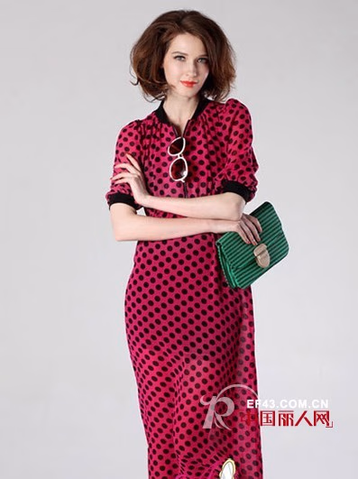 飘逸时尚的波点雪纺长裙,桃红色的底色亮眼时尚,搭配潮人必备的厚底牛津鞋以及撞色条纹手包,彰显个性十足的时尚品味。