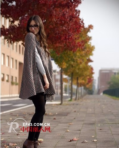 格纹装今年非常流行,这款格纹斗篷外套,很简单的款式,带点英伦风格,尽显文艺范。内搭灰色的毛衣,下穿短裤配上裤袜,秋冬季节这样混搭不仅时尚还能穿出好身段。