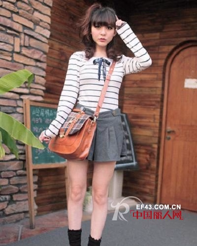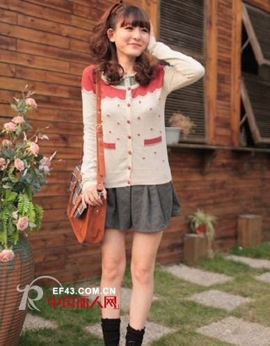红白色的针织外套,点状和花边印图都显得很甜美,配着压折的裤裙和工装挎包,尤有邻家女孩子的甜美气息,清新自然。