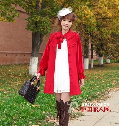 红色呢子大衣,最为独特的天鹅绒衣袖拼接彰显出细腻的的感觉,质感良好的面料带来了最为温柔的穿着体验,袖口处的收边营造出细腻的荷叶边,散发出优雅静谧的独特韵味。