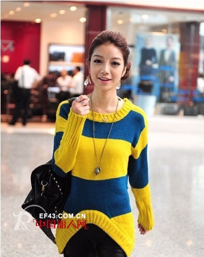 两色入不规则底摆毛衣,蓝色与黄色相撞,非常的清甜优雅,很有色彩感。鲜艳的色彩搭配,个性的衣摆设计,充满了新颖的质感。可以配上项链,更有个性,下穿紧身裤,修长美腿秀出来。