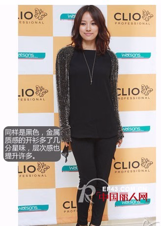 日前李孝利为某产品代言举办签售会。身穿黑色系缀珠管长袖雪纺衫,圆润的衣摆线条显得非常的优雅而可爱,修身的铅笔裤搭配鱼嘴水台高跟鞋展现出迷人的浪漫风,绝好的包裹线条,让身材更加的纤细有型。