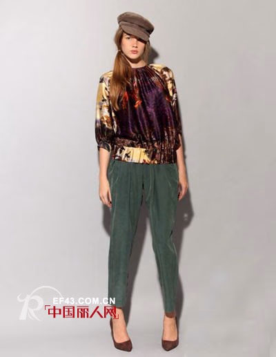 墨绿色的九分裤很显高挑身材,泼墨的五分袖上衣很有气质。