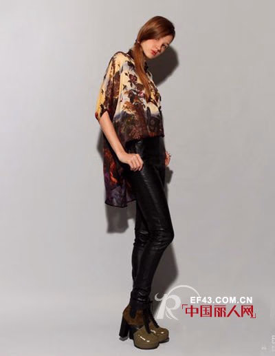 黑色的修身皮裤十分帅气,搭配不规则剪裁的上衣,个性又时尚。