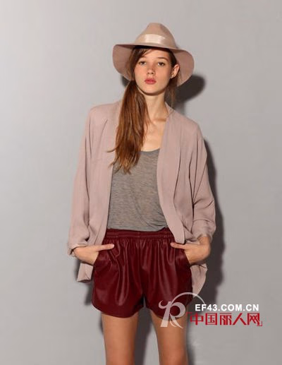 红色的皮革短裤加上灰色的T恤,搭配裸色的西装外套,很有优雅气质。