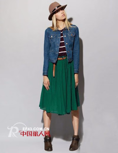 绿色半裙搭配牛仔上衣嬉皮风十足