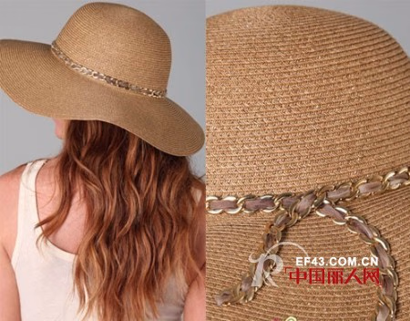 淑女的宽沿帽遇上质朴的编织制作,显得时尚悠闲,加上一条姜丹的金链绸带做陪衬,添加高贵的气息。