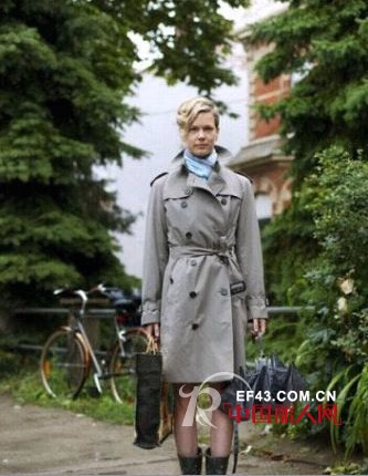 时尚点评:剪裁精良的灰色双排扣外套一直是非常经典的款式,正统的袢扣腰带被她随意的系在腰间使古板的风衣多了一丝丝的时尚味道,塑料质感的平底靴为服装形成整体添加帅气的效果。