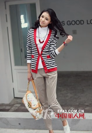 每天穿衬衫 西服也太过于无味了,偶尔换上休闲感的服装也很不错。加上荷叶边处理的立领白衬衫同样适合职场穿着,一件红边黑白条纹的针织衫 增加女人味。