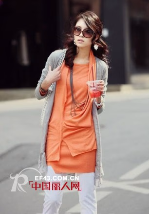 长款针织衫真的是妙用法宝,独特剪裁的橘红色长款针织衫能够衬托好气色。外面搭一件灰色薄款针织衫穿出层次感,下身选择白色休闲裤 让整个人都干净利落起来。