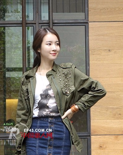 镶珠工装外套,个性的色彩,挺括的面料,充满了时尚的中性气息,肩部采用了小肩章的设计,瞬间增添了可爱的俏皮味道,肩部同时采用了铆钉的装饰,个性鲜明,据有酷酷的街头风。
