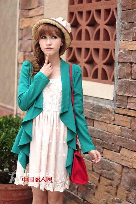 版型不错的一款西装外套,衣襟是大大的荷叶边,特别有飘逸感。没有扣子,内搭连衣裙或t恤敞开穿就可以了,漂亮的颜色,很出众的说。