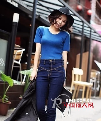 蓝色的紧身圆领衫搭配牛仔高腰裤,气质飙升,外面可以搭配一件黑色的中性西服,将秋冬的流行元素叠穿在一起。