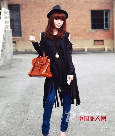 露肩的长袖T恤既应景了天气,又不失你的性感魅力。钉珠的点缀让这款衣服看起来更有质感。流苏的下摆设计,非常优雅风情,可以配上项链,非常的大气时尚,下穿牛仔裤清爽舒适,配上复古的包包,是不是很有典雅古韵的感觉?