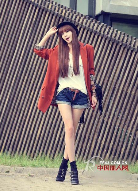 深红色的长款西装外套,松垮的线条,没有拘束感,体现出轻松的休闲魅力,挺括而有型的大翻领,非常的潇洒而帅气,具有酷酷的中性味道。