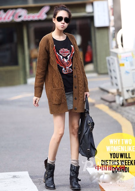 深咖啡色的毛衣外套,流畅的直筒线条,让身材呈现出立体的质感,穿着起来塑造出纤细的身材曲线,深沉的色彩,给人以典雅的淑女气息,精致的剪裁,非常的帅气。