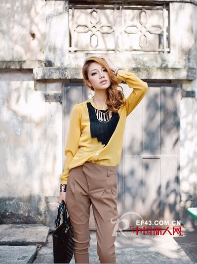 黑色拼接阶梯装饰长袖衬衫,清澈透气的小资气息不时洋溢着,搭配高腰西裤,彰显干练OL感,非常有女人味,带着优雅的气质在秋风中漫步,飘散空中的树叶缓缓落下,只剩下一缕时尚的气息,弥漫天际。