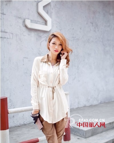 欧美帅气腰间系长袖衬衫,很干净清新的一款靓衣,简洁却很百搭,领口卡其色非常的显气质,系带风格可以很好的束缚腰身,更加显瘦,下穿卡其色长裤,将优雅的气质尽显无遗。