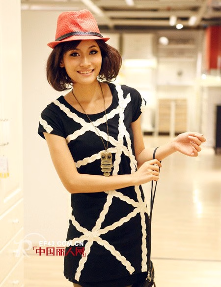欧美街头简洁贴布装饰短袖修身连衣裙,简约CHANEL风撞色纯棉T恤裙,修身效果超好,高端贴布装饰嬉皮时尚,单穿或搭打底裤俱佳!
