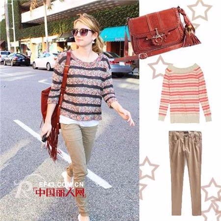 条纹针织衫和小脚哈伦裤的搭配,红色流苏包显得十分有生气,在行走中飘荡着节奏感。