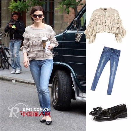 流苏款短款上装搭配牛水洗牛仔裤,轻松而随意,就让我们一起这样出发吧。