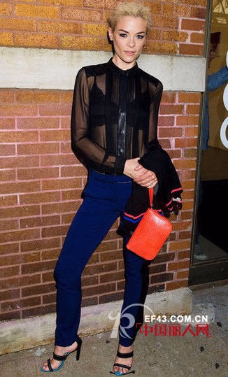 宝蓝色裤子非常好看,边沿的黑色拼接拉长了整个线条,搭配透视装的衬衫,非常时尚。