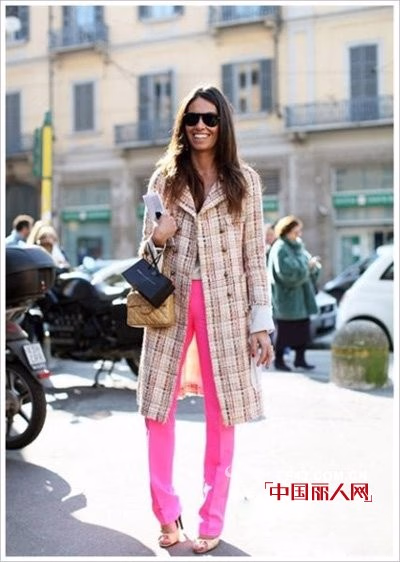 亮粉红裤子是全身亮点,粉红格子长款大衣很有大牌的味道,手拎包以及墨镜让整体更加充满酷感。高跟鱼嘴鞋代替平底鞋,更有美式街头摩登范儿。
