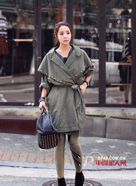 大翻领的造型超具明星气质,铆钉的装饰个性十足,敞开式的宽领装饰,衬托的腰身也更显纤细。搭配个性打底裤或者小脚裤都OK。
