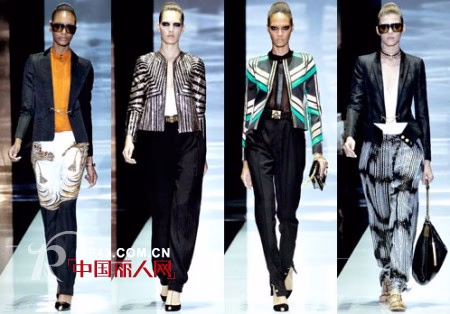 Gucci 2012春夏依旧以硬朗的女性风格出现,金属色搭配黑色雪纺,性感而神秘。大面积使用流苏作为裙摆,延续了去年的女装风格,同时新加入更硬朗的金属元素。特别是短打外套,显高挑的同时,更让人变利落。