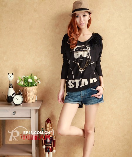 宽松蝙蝠袖款,帅气朋克味道的抽象人像印花,用金属链装饰,肩部特别采用了羽毛设计,倍添大牌范儿,贴合肌肤柔滑质感,不管单穿还是搭配外套都是超赞选择。