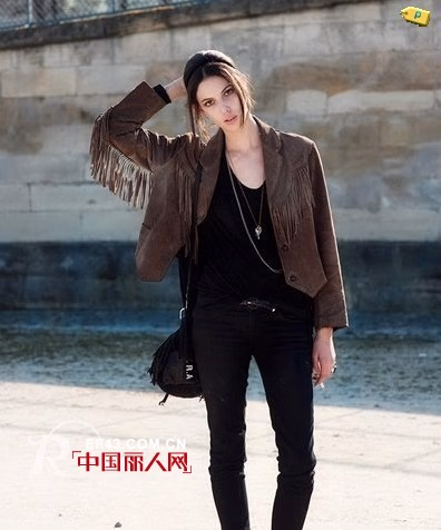 流苏短款外套,设计精美,运用流苏的元素将时尚与浪漫集于一身,非常大气。精致的裁剪,下摆是倒三角的设计,非常精美。内搭纯色的背心,下穿同色系的长裤,配上靴子,很有个性。