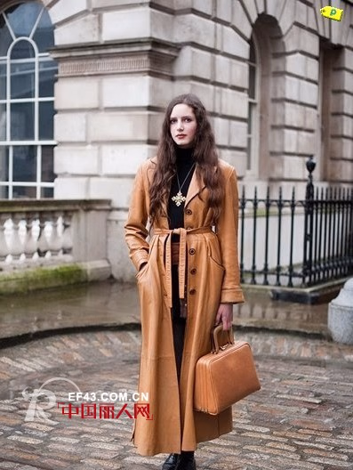 棕色长款皮衣披风,大气唯美,很少有人将披风穿的如此优雅帅气,系带的款式,可以随意系上或是敞开。内搭黑色羊毛衫下穿长裤,就很时尚。配上复古的同色系手提包,非常帅气时尚。