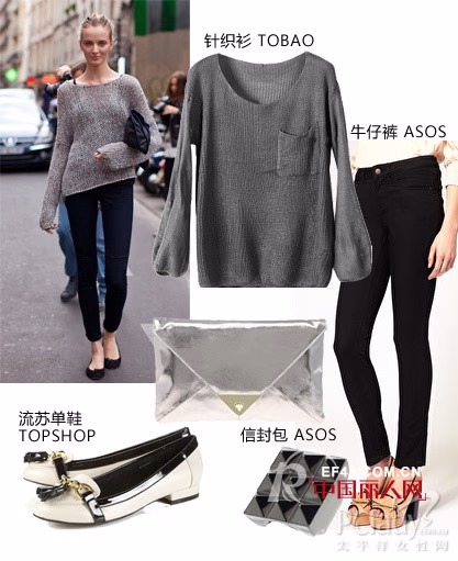 稀疏的编织肌理隐约透出肌肤,看起来格外性感。薄面料还会令骨感尽显。适合秋天的灰色系绝对可以派上大用场,配搭黑色skinny,谁说修长感不能轻易搞定。复古流苏单鞋与浅色信封包更加丰富层次感。