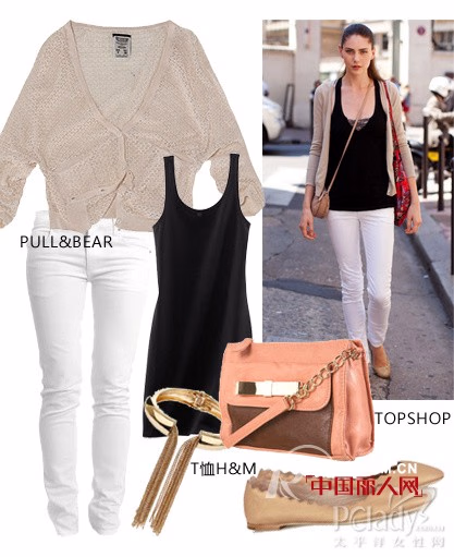让人亲近的裸色针织衫真的会马上增加亲和力,彰显柔美一面。白色Skinny与黑色吊带组成一身儿。裸色平底鞋与包包做到上下呼应。梳起清爽的马尾辫,自然的红色双唇透着水灵清新感。