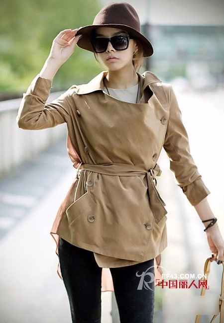 淡雅的卡其色彩的中长款风衣外套,挺括而有型的小翻领设计非常的干练,细腻的面料,显露出不凡的上乘品味,前后不对称的衣摆,更加的个性。