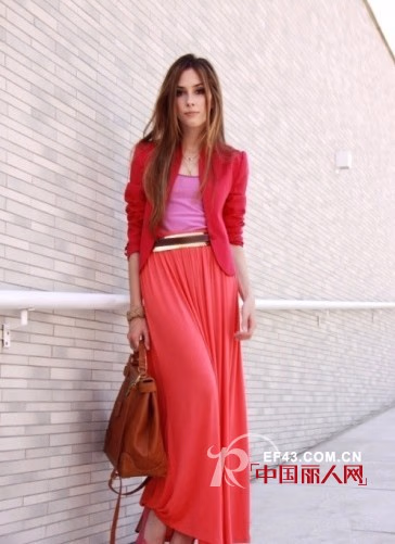 红色西服外套搭配朱红色百褶裙,褐色腰带和栗色头发相呼应,粉色点缀更显少女情怀,整体提搭配不失稳重,在飒飒秋季凸显成为一道红色风景。