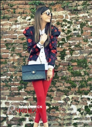 黑色的西服外套,红色底花和泡泡袖的设计使其并不呆板,搭配上白色衬衫和红色紧身裤,金属色太阳镜和金属链皮包,张弛有度,让火辣带着优雅,优雅中泛着可爱。