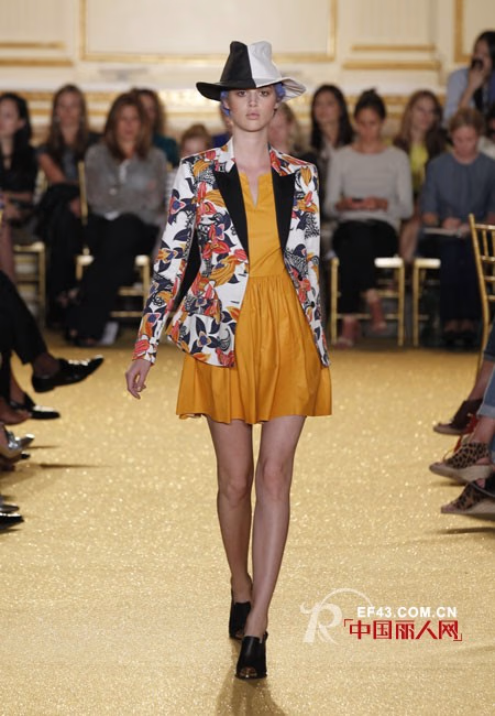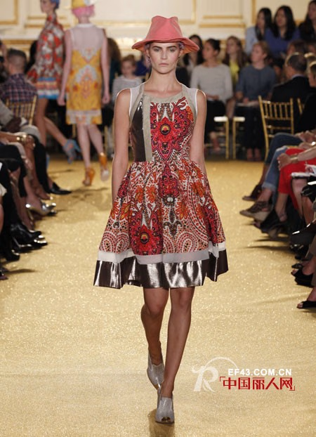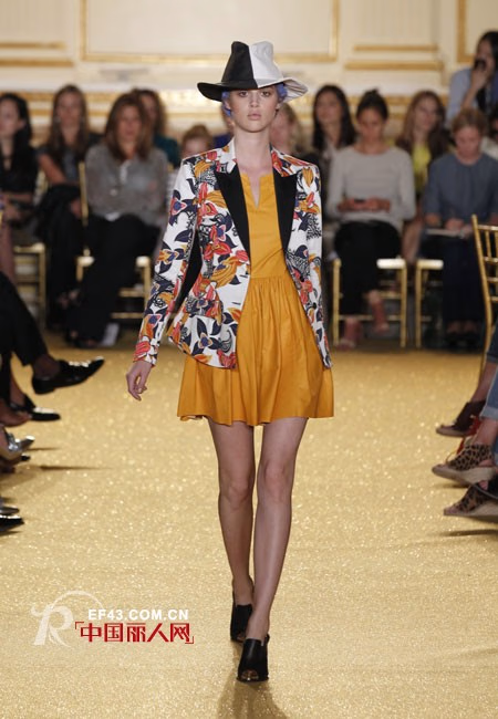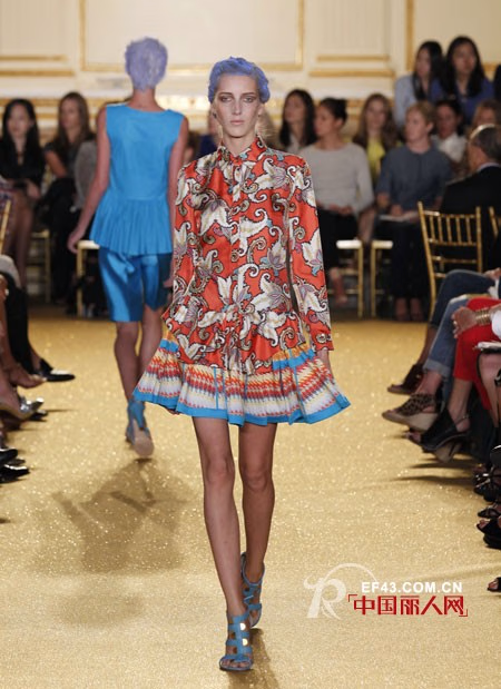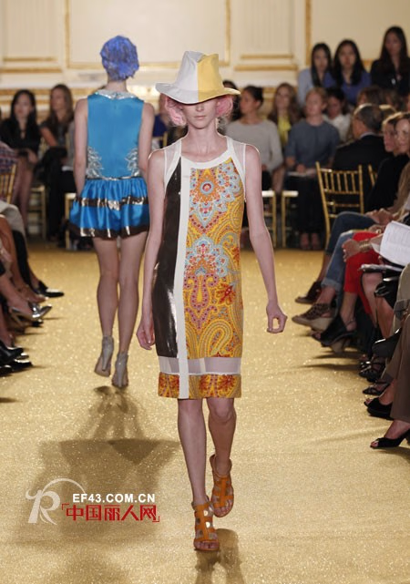 在Thakoon的2012春夏纽约时装周的秀场上,我们看到了一个鲜艳的色彩与凌乱的印花图案还有各种不同面料的结合,还添加了许多手工刺绣,令整个气场非常特别。在许多款式上,还用上了金色的面料作为底色或花边,令服装更具流线感。