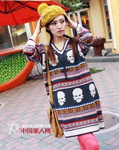 长款民族风毛衣,雪花民族风与个性骷髅的结合,大爱的彩色提花丰富醒目,节奏感很强。性感的V领和韩版宽松搭配,简约大气,搭配亮色打底裤出街抢眼。