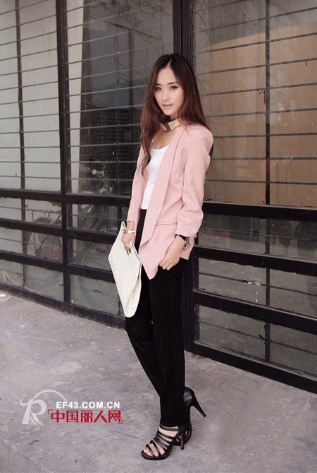 淡粉色的西装外套,细腻的面料,充满了上乘的品味,挺括的面料,让衣衣非常的有型,褶皱感觉的小泡袖,透露出非常可爱的俏皮味道,弧度感觉的小翻领,更加的干练。