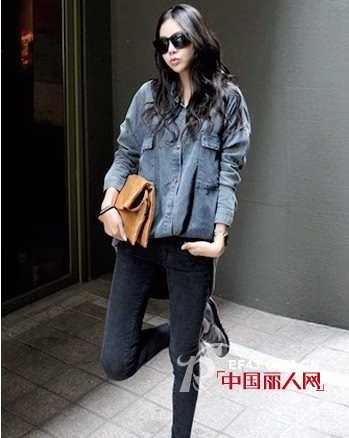 要复古又想耍帅,必定是牛仔衬衫,应季性很强,灰黑色牛仔不是他别常见,想要搭配好也要在颜色上花心思,搭配黑色小雪花修身牛仔裤,保险又帅气,要有理想的状态一定记得内扎起来,大胆的MM可以把手包换成鲜亮些的颜色。